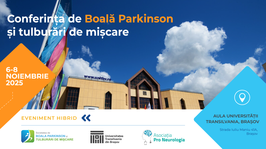 În perioada 6-8 Noiembrie 2025 vă invităm la Conferința de Boală Parkinson și tulburări de mișcare, ce se va desfășura în format hibrid, în Aula Universității Transilvania din Brașov și online. Acest eveniment se desfășoară sub egida Societății de Boală Parkinson și tulburări de mișcare, al Asociației Pro Neurologia și al Universității Transilvania Brașov.